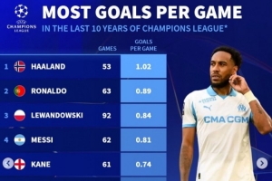 近10年欧冠场均进球榜:哈兰德压C罗居首 莱万、梅西、凯恩列前五