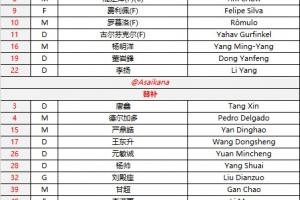成都蓉城首发:1-蹇韬、2-胡荷韬、19-董岩鋒、22-李扬、5-提莫-莱切特、11-古尔芬克尔、16-杨明洋、8-周定洋、7-韦世豪、10-罗慕洛、9-费利佩