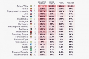 体育资讯12月12日讯 opta在当地时间12月11日对本赛季欧联杯形势进行了新的预测,阿斯顿维拉夺冠概率达到34.3%,罗马8.6%第二。